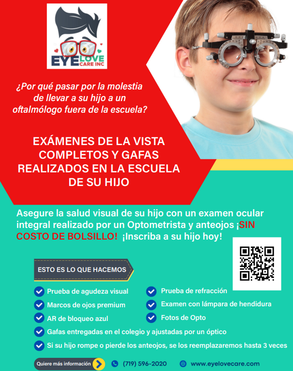 Los exámenes de la vista y anteojos se ofrecen en la Escuela Primaria Colfax los días 16 y 17 de octubre. Si tiene seguro médico, se le facturará; si no, ¡no tendrá costo!