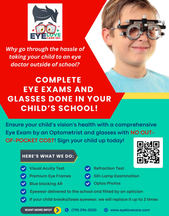 Eye Exams and Glasses are provided right in Colfax Elementary School on October 16th & 17th. If you have insurance, it will be billed if you don’t there will be no cost!