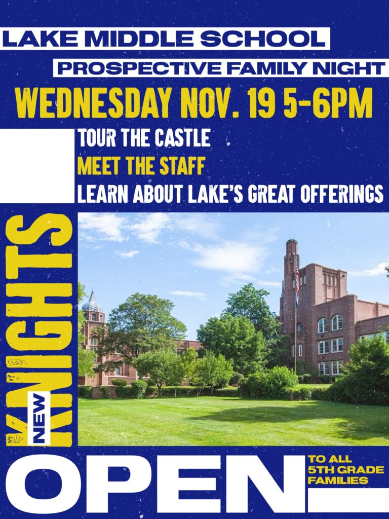 Lake Middle School Prospective Parent Night: November 19th, 5-6PM ~ Noche informativa para padres: 19 de noviembre, de 5:00 a 6:00pm