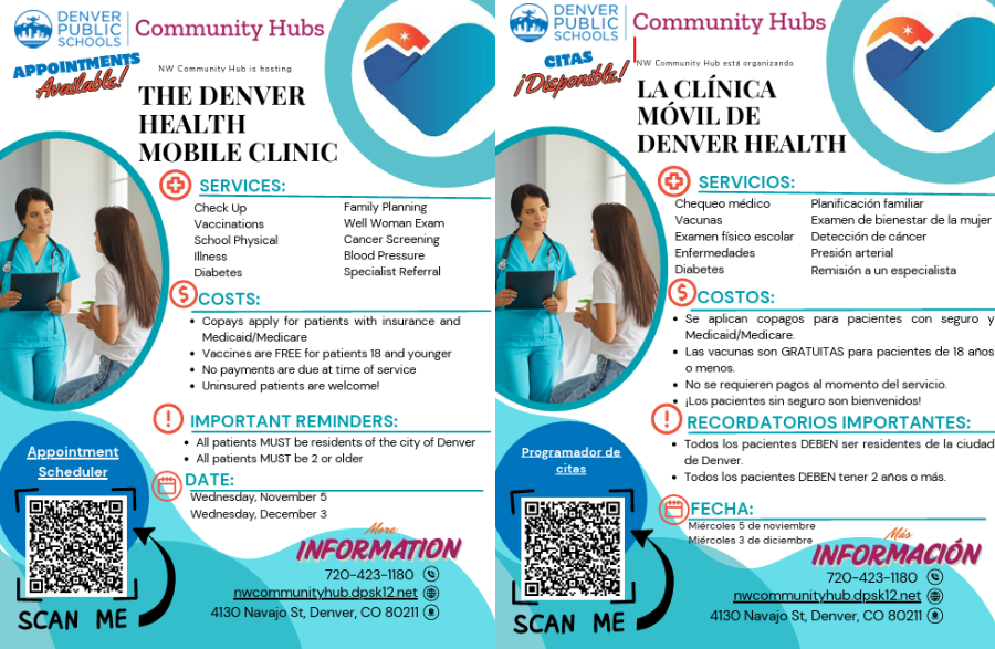La Clínica Móvil de Denver Health estará en el Centro Comunitario del Noroeste de la Escuela Primaria Trevista. Hay citas disponibles los miércoles 5 de noviembre y 3 de diciembre. Por favor haga clic AQUÍ para hacer una cita.